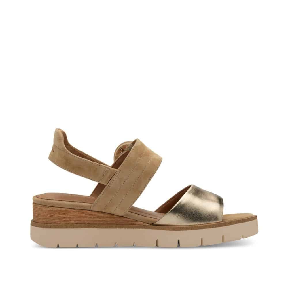 Sunce voli sportsko elegantne modele, pogotovo kad je u brončanom sjaju. Stabilna je ovo sandala za hodanje jer poprečni remeni čvrsto drže stopalo na tabanici, a obuvanje uz čičak čini ju funkcionalnom i jednostavnom ne samo za obuvanje nego i za regulaciju širine. Platforma uz nagibnu petu čini svaki korak laganim bez osjećaja da hodate po tvrdim površinama. Tabanica je s Touch it uloškom, mekoća je zagarantirana. Vaš je izbor da li je u funkciji elegantne sandale ili sportskog modela uz traper.
